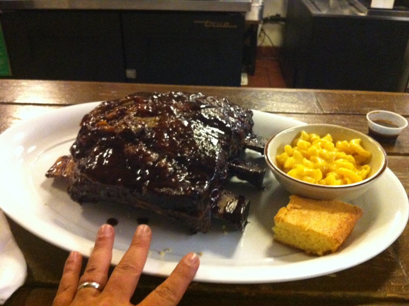 Now, it most places, you get bones about 5-6 inches long, with 3-4 inches of meat on them, in which case you’ll find anywhere from 6-12 bones on your plate. A few places serve larger bones, but fewer. Well, Sekou’s doesn’t do either of them. For this place, a full rack meant three large bones with more meat than I’ve ever seen grace a set of ribs. I mean, we’re talking well over five total pounds, headed towards ten. It was awesome, as you can see in the photo. Fred Flinstone would have felt right at home.