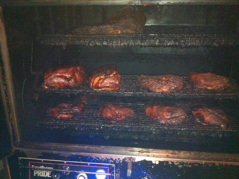 A few minutes into the conversation, I asked if I could sample just a bite of his brisket, at which point he hustled me back to the smokers – the altars in this church of slow-cooked meat. As you can see, he had pork butt roasts, tri-tips, ribs and briskets working. He found the brisket he wanted, and carved several good slices right there at the smoker. Folks, I was in Southern Smoked Heaven. Melt in your mouth only begins to describe the sensation.