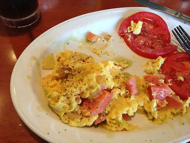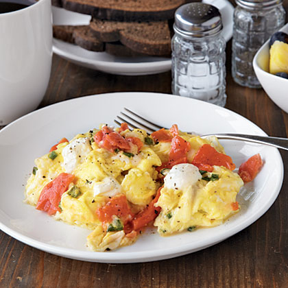 When eggs are about done, add salmon and cream cheese (if using). Continue drawing spatula across bottom of pan until egg mixture is slightly thick but still moist; do not stir as that will start to tear the scrambled eggs into more pieces than you want.