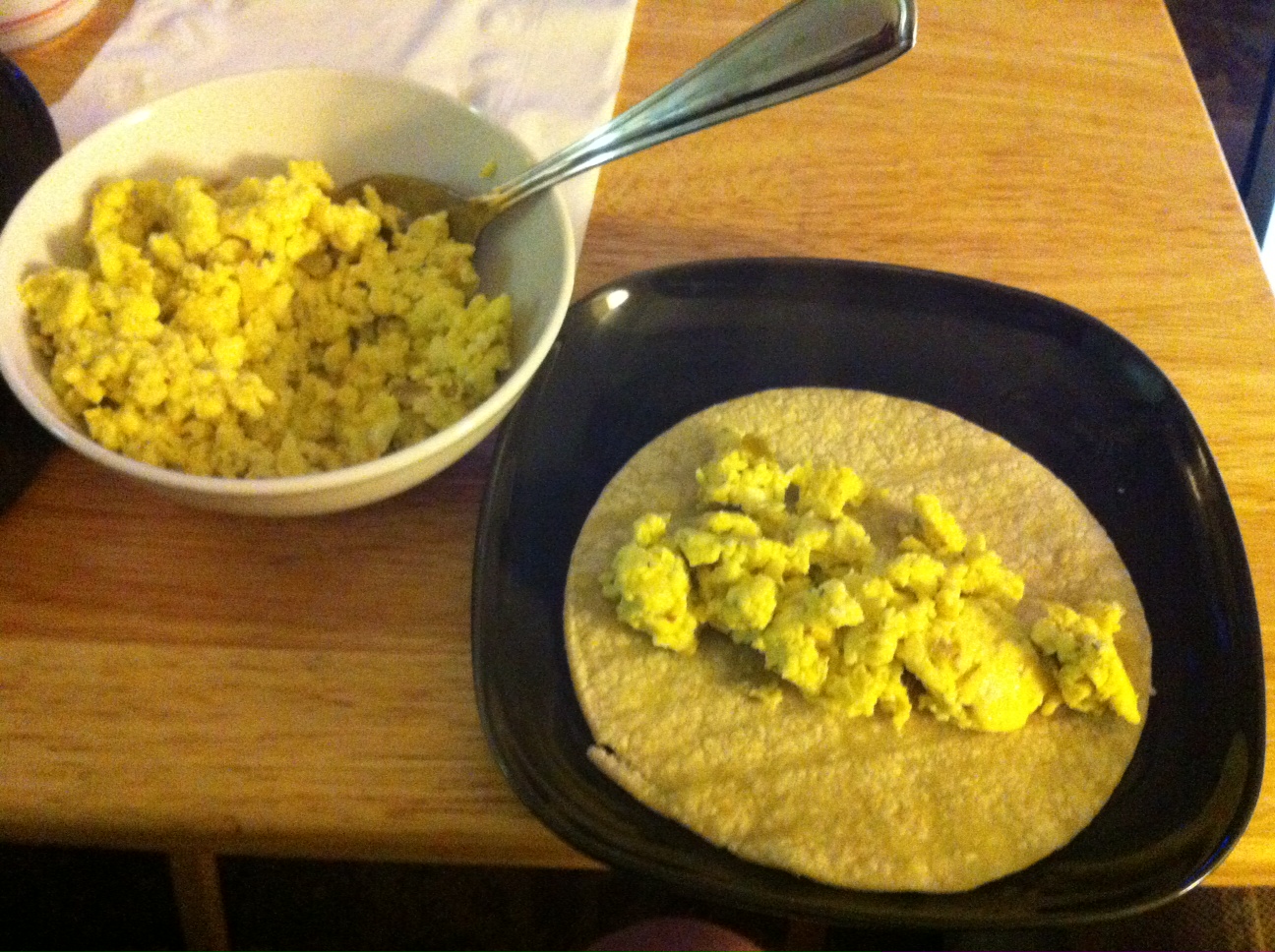 Remove eggs from pan with a slotted spoon once they have reached the consistency you prefer – creamy to well done. You will notice that, even with well done eggs, there will be some “water” in the pan. That’s from the salsa, so pay it no attention. That water is the reason you’re using a slotted spoon to remove the eggs from the pan.