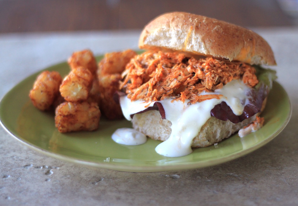 Using two forks, shred the chicken, then return to slow cooker. Stir it all up so it’s all nicely coated with sauce and everything’s happy. Let that simmer for 30 minutes or so if you can. At least let it sit there while you’re getting everything ready to serve.